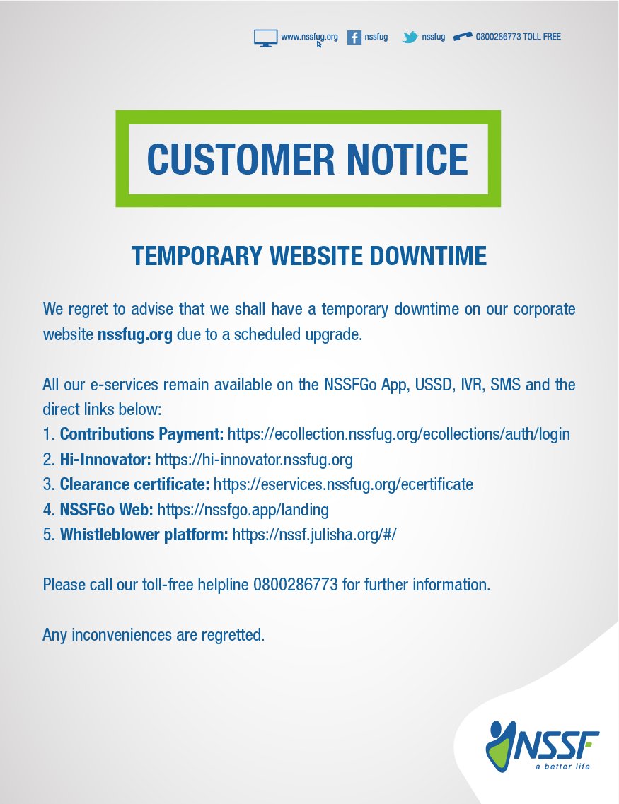 Nssf Uganda On Twitter Customer Notice We Regret To Advise That We Shall Have A Temporary Downtime On Our Corporate Website Https T Co Iczkfxy3lv Due To A Scheduled Upgrade All Our E Services Remain Available